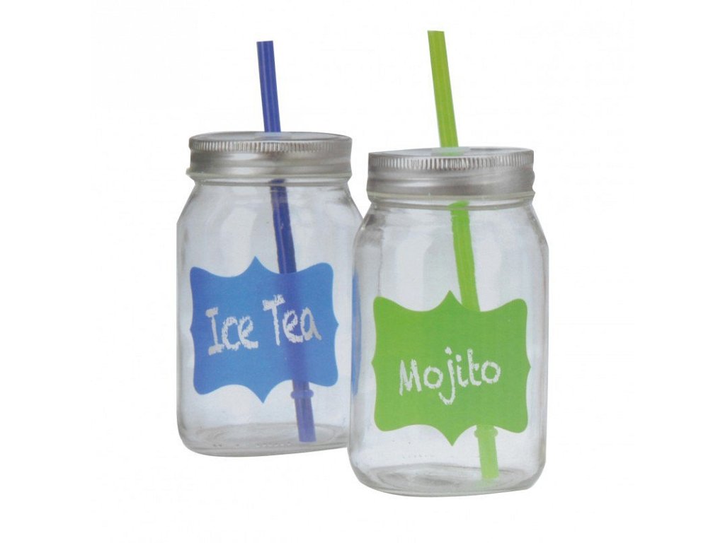 Sklenice na míchané drinky s víčkem a brčkem - ať už na alkoholické nápoje nebo bez alkoholu, s ovocem, ledem,... Materiál: sklo, kov - víčko na závit, plast - brčko ve víčku. Sklenice jsou s barevným polem, do kterého lze napsat název nápoje, jméno pro rozlišení sklenic na párty, vzkaz, obrázek,….