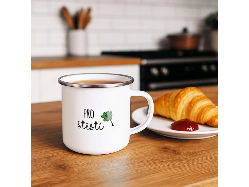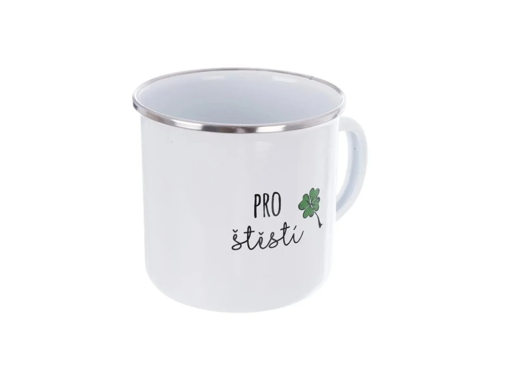 Smaltovaný rovný hrnek s uchem a dekorem PRO ŠTĚSTÍ je stylovým a zároveň praktickým doplňkem pro každodenní používání i jako milý dárek. Klasický design doplňuje nápis, který potěší a vykouzlí úsměv při každém napití.