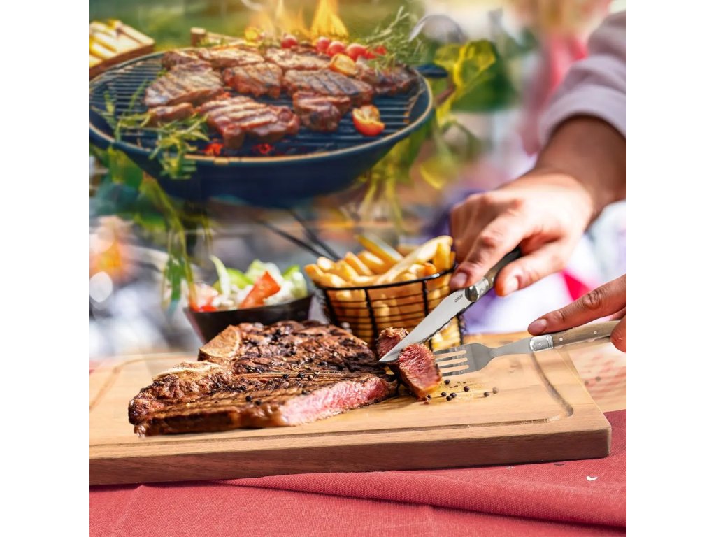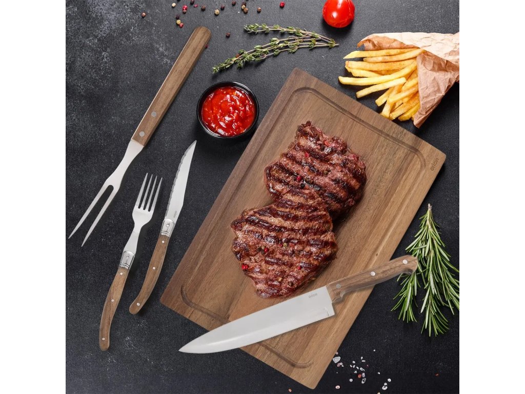 - Rozměry: vidlička d. 22 cm, nůž d. 23 cm, vidlice d. 33 cm, nůž d. 32,5 cm, prkénko 37x23x1,5 cm, celkové rozměry balení 42x40x6 cm.