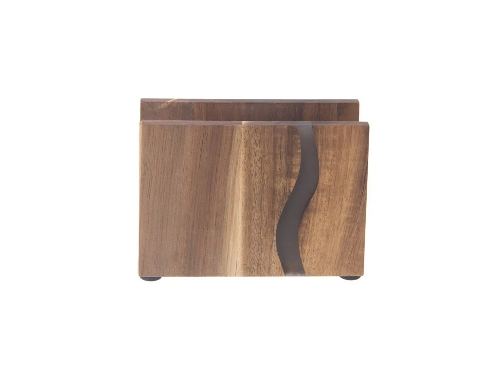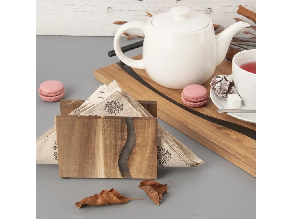 Kolekce RIVER spojuje prvek pryskyřice zasazené do akáciového dřeva ve tvaru plynoucí řeky. Tyto výrobky jsou velmi atraktivní a vytváří skvělé dekorativní prvky v interiéru. Stojan na ubrousky bude pěkným doplňkem prostřeného stolu. Díky pěnovým podložkám neklouže po povrchu a nepoškodí nábytek. Ubrousky do něj můžete přeložit po délce nebo úhlopříčce.