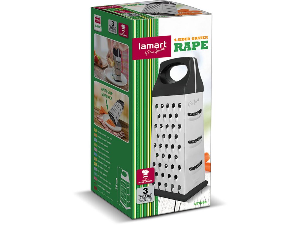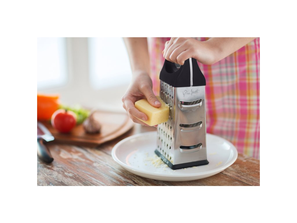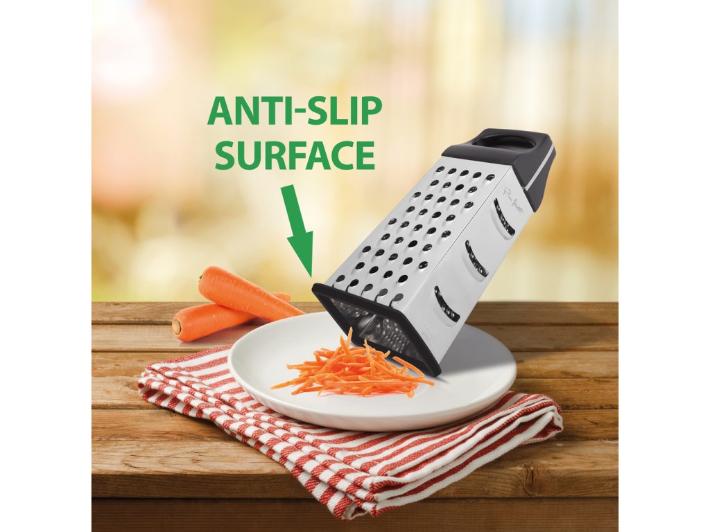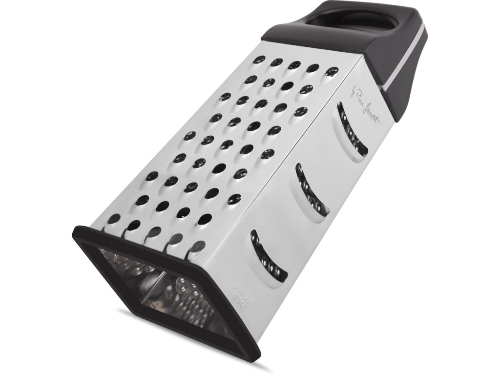 Struhadlo čtyřstranné nerezové pro ruční strouhání sýrů, zeleniny, ovoce atd. Čtyři typy strouhácích ploch zajišťují dostatečný výběr síly potravin. Plastová pevná rukojeť. Protiskluzová silikonová guma na spodní části. Před prvním a po každém použití umyjte teplou vodou se saponátem, opláchněte a osušte.- Pevná plastová rukojeť