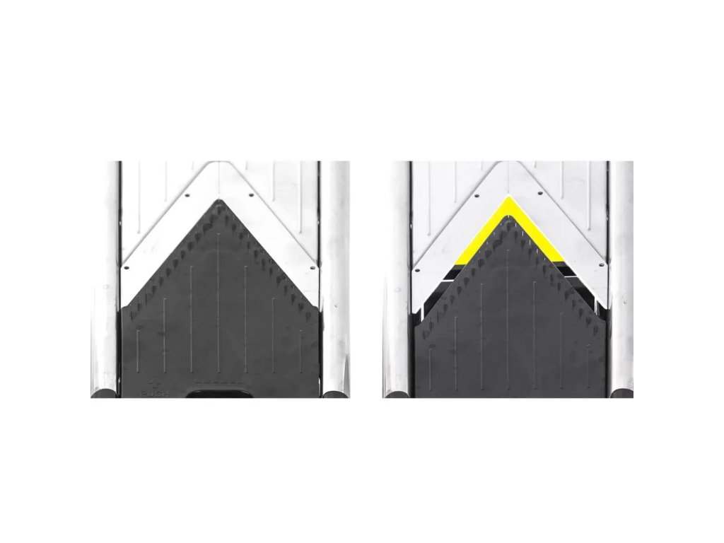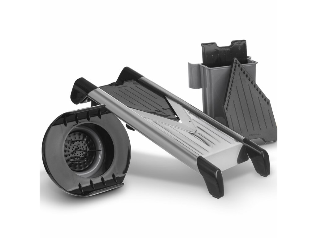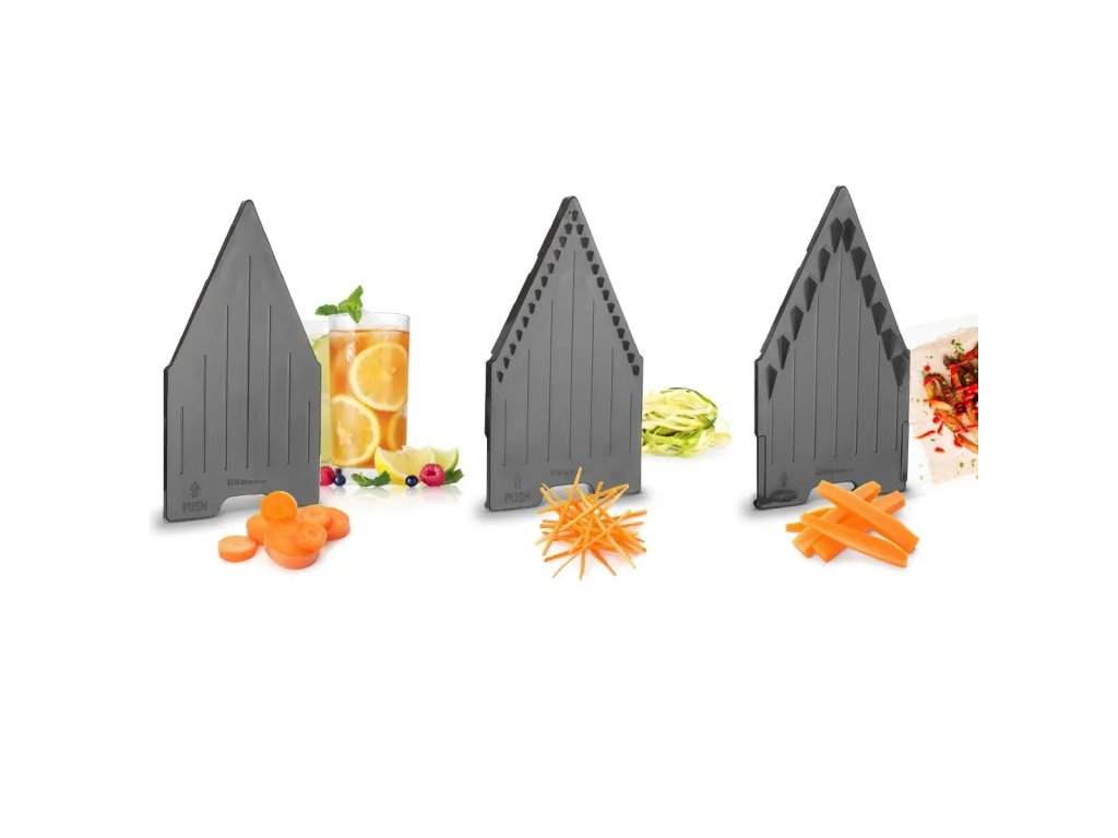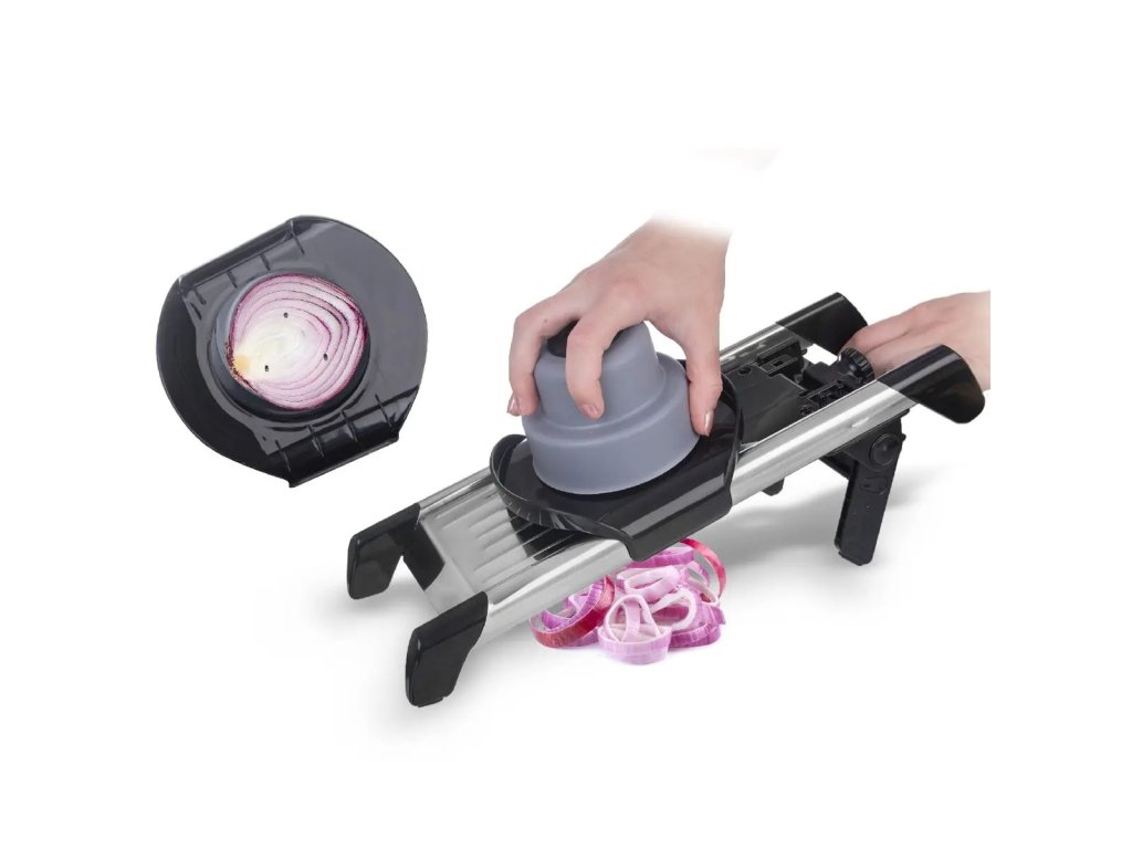 Výměnné části jsou opatřené ostrými nerezovými břity, a navíc je možné regulovat tloušťku plátků, hranolků od 1 mm do 6 mm. Součástí je klobouček, tzv. vodící rukojeť, pomocí které potravinu strouháte, aniž byste se zranili. To se hodí při strouhání cibule, rajčat, která jednoduše napíchnete na hroty uvnitř kloboučku a můžete z vnějšku přejíždět po ploše struhadla. Sklápěcí protiskluzové nožičky zajistí správný náklon a stabilitu, ve skříňce ušetří místo při skladování.