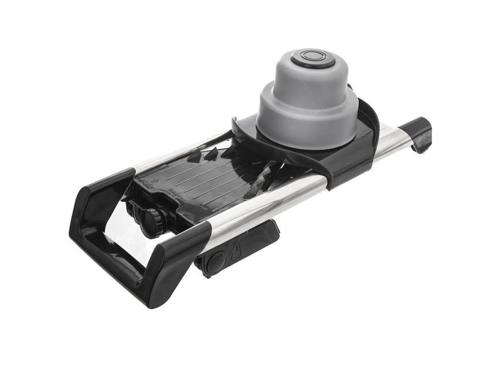 - základní tělo struhadla s protiskluzovými nožkami a regulačním kolečkem, kterým lze nastavit tloušťku krájených potravin