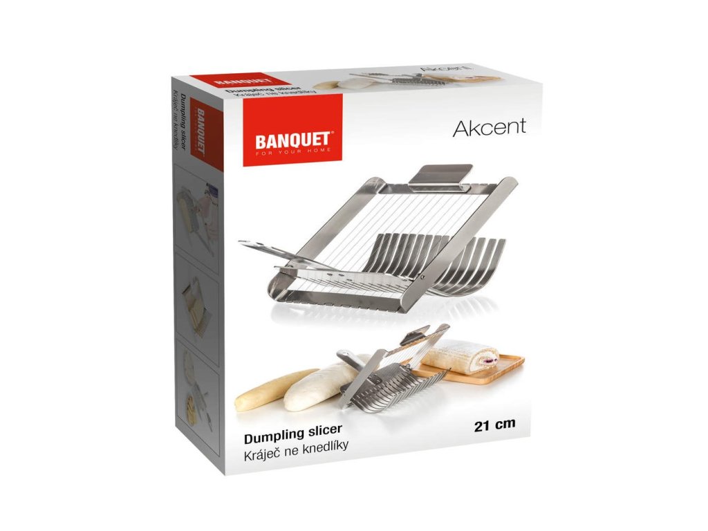 Kráječ na knedlíky strunový AKCENT 21 cm vyroben z nerezové oceli, je určen pro profesionální i domácí použití. Kráječ je ideálním pomocníkem při krájení měkkých právě napařených nebo uvařených knedlíků. Kráječ je opatřen podběrákem, který vám nejdříve pomůže jednoduše a rychle vyndat uvařené knedlíky z horké vody. Následně je kráječem rozkrojíte na souměrné plátky. Dále jej využijete také ke krájení měkkých piškotových rolád, měkkých sýrů typu mozzarella a jiných měkkých potravin.Doplňkové parametry