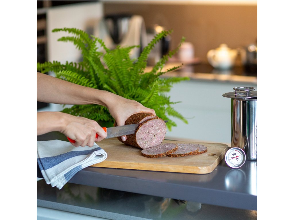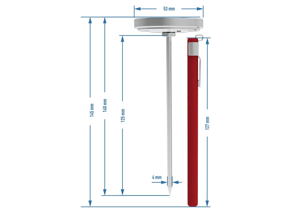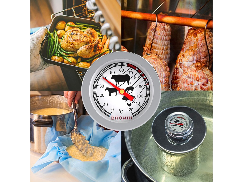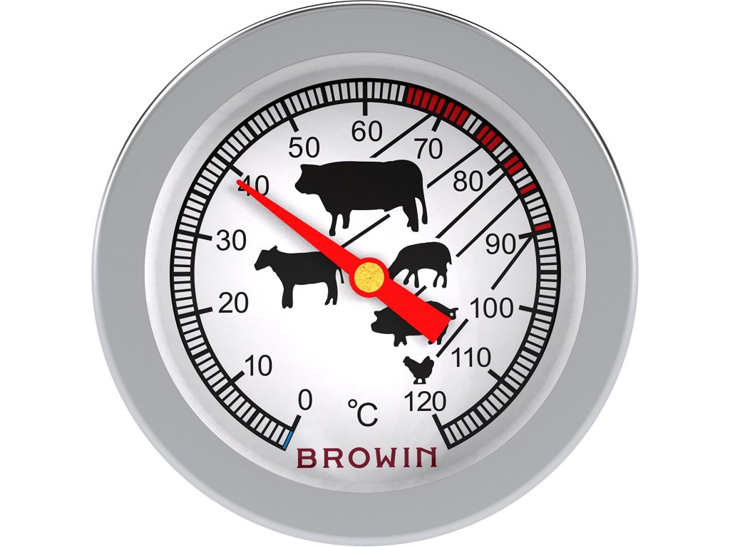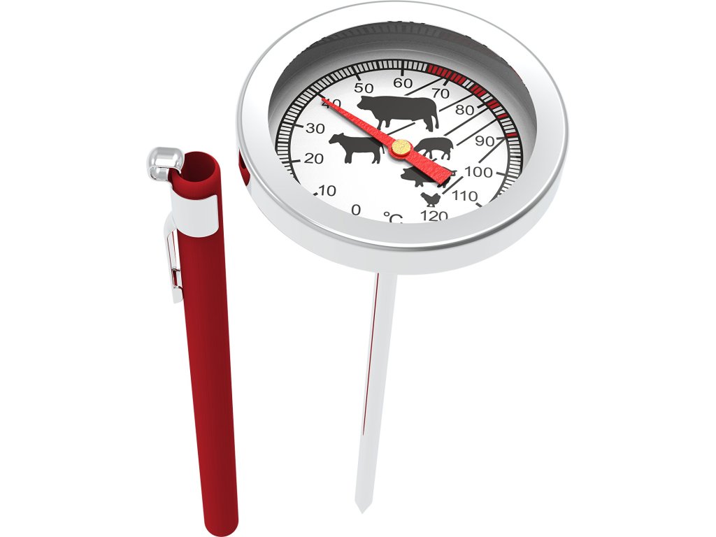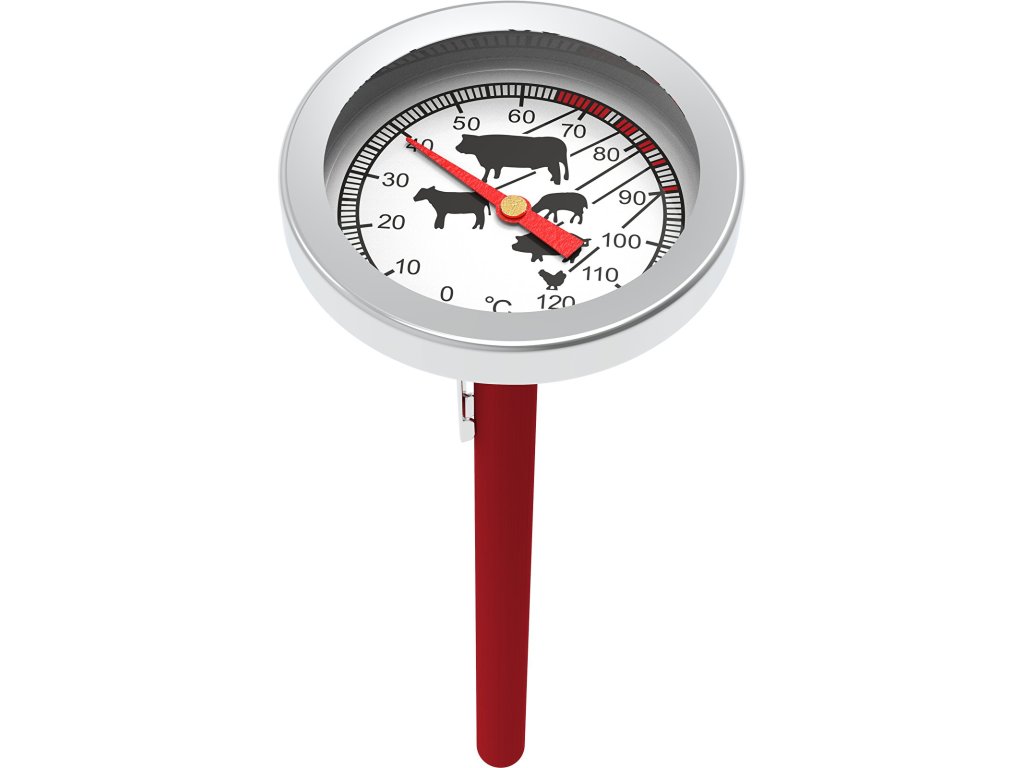 Jedná se o jednoduchý a nesmírně užitečný nástroj, díky kterému budete mít kulinářský proces pod kontrolou a dosáhnete kýženého výsledku. Teploměr je vybaven graficky zpracovanou stupnicí s rozsahem 0 - 120 °C, která určuje ideální teplotu pro přípravu drůbeže, vepřového, telecího, jehněcího a hovězí maso.