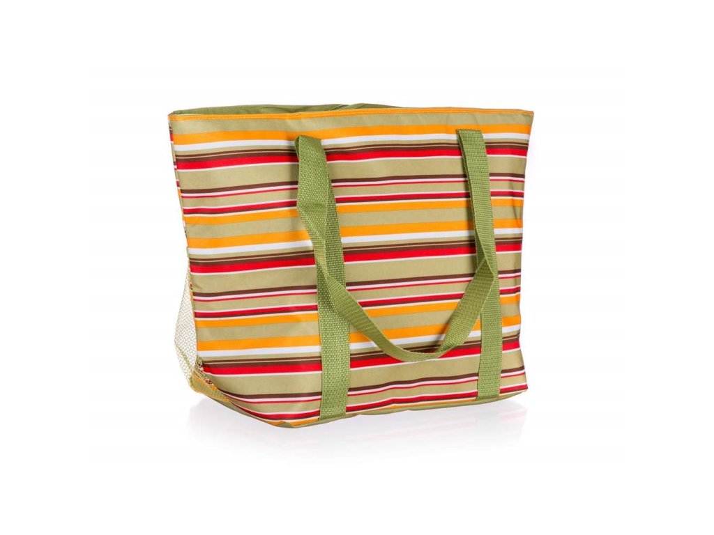 Chladící taška velká 25 l slouží k uchování potravin v chladu, je ideální na pláž, piknik, kempování, v domácnosti. Vnější materiál je vysoce odolný polyester, vnitřní materiál je izolační vrstva PE pěna. Vnitřní hladké stěny umožňují velmi snadnou údržbu a očištění v případě znečištění potravinami. Dodávána v zelené barvě s barevnými pruhy.Doplňkové parametry