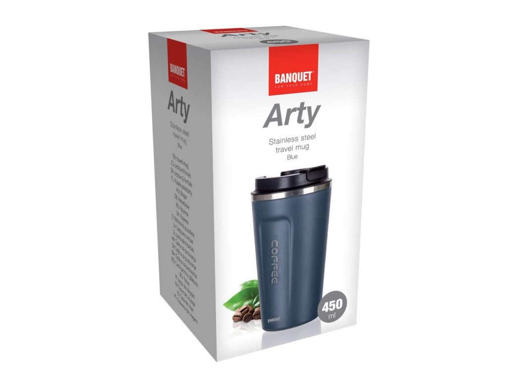 Dvoustěnný cestovní termohrnek ARTY v modré barvě, je vhodný na teplé i studené nápoje. Vnější část je vyrobena z nerezi 201, vnitřní část z nerezi 304 a víčko z plastu. Využitelný objem je 450 ml. Tělo hrnku je vakuové, udrží nápoje déle horké či studené. Víčko není nepropustné, doporučujeme uchovávat ve svislé poloze.Doplňkové parametry