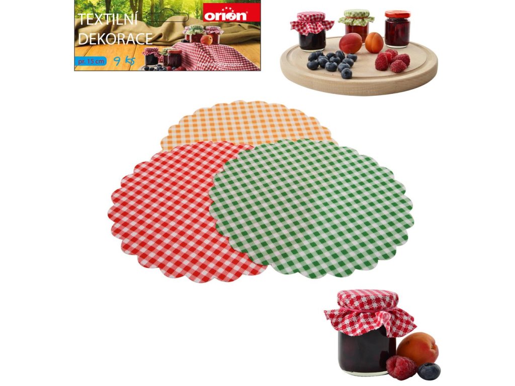 Textilní dekorace na víčko pr. 15 cm 9 ks