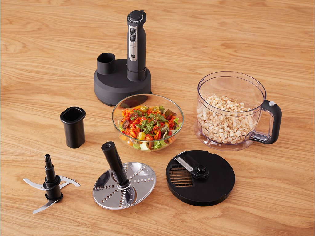 Díky vyměnitelným nástavcům perfektně zpracujete širokou škálu potravin, jako je čokoláda, zelenina, ovoce, tvrdý sýr, pečivo na strouhanku a mnoho dalších. Nádoba s různými nástavci vám pomůže s krájením, strouháním, sekáním a výrobou kostiček. Sekací nože použijte při menším množství surovin jednotlivě a při větším naplnění nádoby umístěte dva nad sebe. Tak bez problémů rovnoměrně nasekáte i plnou nádobu bylinek, cibule a jiných surovin.