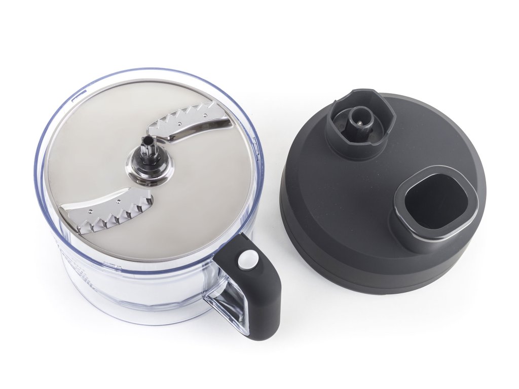Nádoba z kvalitního bytelného plastu je vysoce odolná proti nárazu. Nebojte se sekání tvrdých potravin, nádoba to hravě vydrží. Horní víko nádoby v matném černém provedení se může pochlubit otvorem pro vhazování potravin za chodu. Teď už nemusíte přístroj vypnout a otevřít při každém přidávání ingrediencí. Pěchovadlo přesně kopíruje otvor pro přidávání surovin.