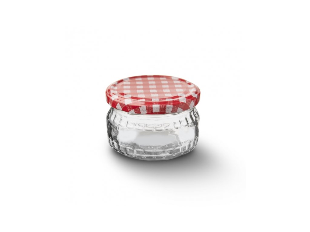 Zavařovací skleněná transparentní sklenice se závitem o objemu 0,21 l, s kovovým víčkem v dekoru kára.