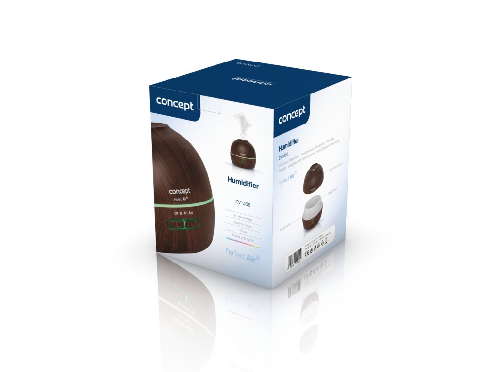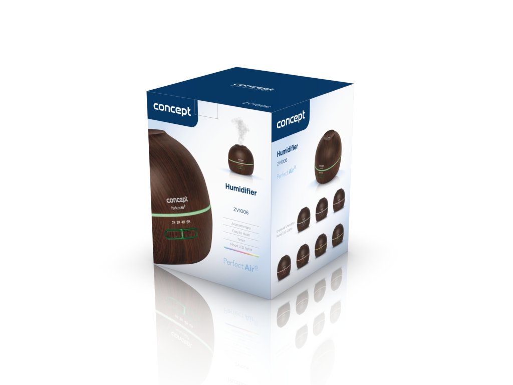 Zvlhčovač vzduchu ZV1006 z řady Perfect Air je spojením zvlhčovače a aroma difuzéru. Vyniká moderním designem tmavého dřeva doplněným o barevné ambientní podsvícení. Je vhodný do místností o velikosti až 20 m² a nabízí 2 režimy s maximální výkonem 40 ml/h. Díky svému kompaktnímu rozměru zapadne do každé domácnosti. Disponuje zásobníkem na vodu s objemem 300 ml, který dokáže vytvářet jemnou páru po dobu až 12 h. Při nedostatku vody se přístroj automaticky vypne.