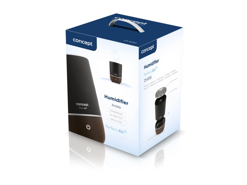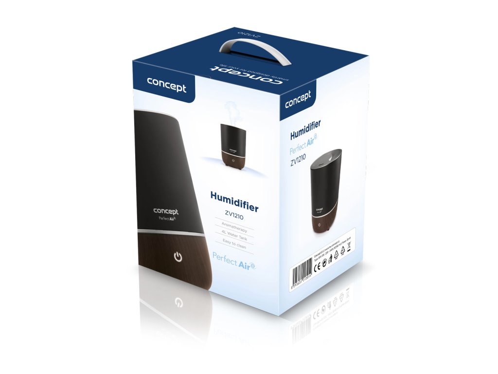 Zvlhčovač vzduchu ZV1210 z řady Perfect Air je spojením zvlhčovače a aroma difuzéru. Je vhodný do místností o velikosti až 30 m². Nabízí 3 úrovně intenzity páry s maximálním výkonem 260 ml/h. Disponuje zásobníkem na vodu o objemu 4 l, který dokáže vytvářet jemnou páru po dobu až 26 h. Při nedostatku vody se přístroj automaticky vypne.